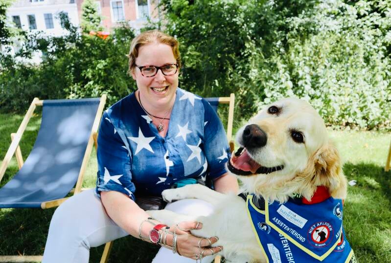 Omschrijving foto: Ik zit in een strandstoel in een park, Joyca zit met zijn voorpoten op mijn schoot en ik hou zijn poten vast. Samen kijken we in de camera en Joyca lijkt ook te lachen net als ikzelf