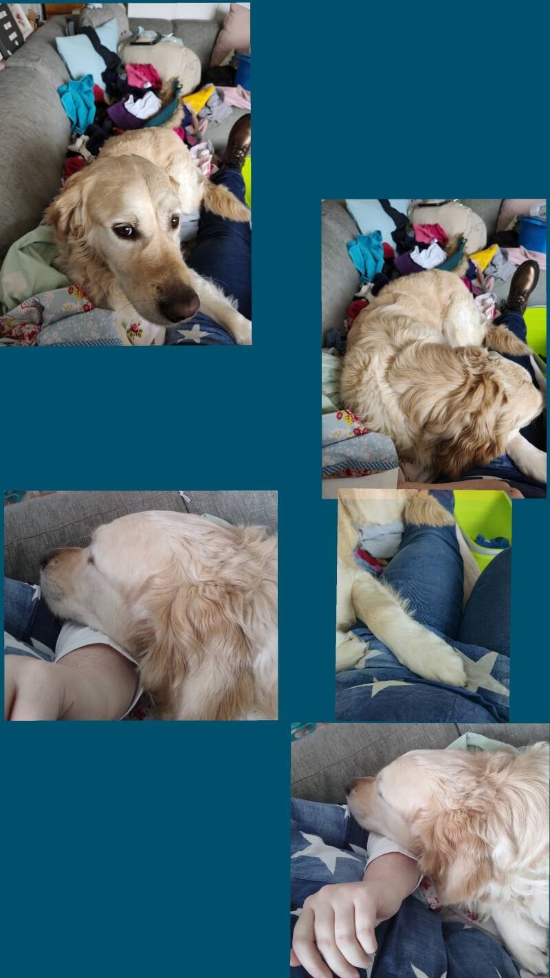 Op deze fotocollage dwingt Joyca mij tot rust. Ik had al een tijdje last van hartkloppingen en mijn hart sloeg steeds over. Dit signaleerde hij toen ik was aan het vouwen was en hij kwam prompt bovenop de was liggen met zijn kop op mijn arm, hierdoor moest ik wel rust pakken.