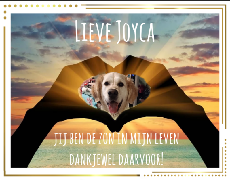 2 handen die een hart vormen met duim en vingers, in het hart een foto van Joyca en op de achtergrond een ondergaande zon. Met daarin de tekst: Lieve Joyca, jij bent de zon in mijn leven. Dankjewel daarvoor!