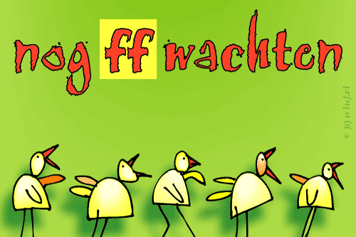 Een plaatje met kippen op een groene achtergrond, en daarbij de tekst: nog ff wachten