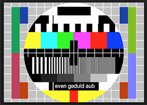 Foto van een gekleurde bol waarin de tekst staat: even geduld aub. Deze kwam vroeger in beeld als er een storing was op de Nederlandse televisie