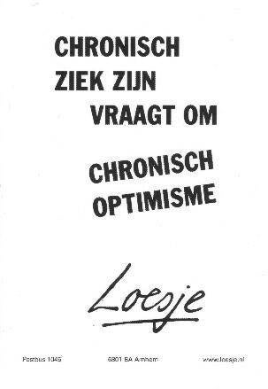 Maar toch ondanks mijn aandoeningen, doe ik hard mijn best om ook chronisch positief te blijven. En eerlijk is eerlijk, dit gaat me best goed af, al zeg ik het zelf. Ik probeer te doen wat binnen mijn kunnen ligt. Dat dit kunnen steeds minder wordt naarmate de jaren voorbijgaan, is helaas niet anders. Ik probeer met de dag te blijven leven en niet te ver vooruit te kijken. Zodra ik dit toch eens doe, maakt me dat bang en verdrietig. Want ja, als ik terugkijk hoeveel ik nog kon een paar jaar geleden dan is het behoorlijk confronterend met wat ik nu nog kan. Daarom geniet ik maar extra van alles wat me nu nog wèl lukt, ik weet immers niet voor hoelang ik dit nog ga kunnen voor ik ook daar weer afscheid van moet nemen...