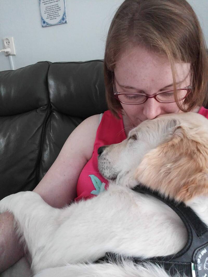 Naarmate de opleiding van Joyca vorderde, moest ik zelf ook leren om vaker met alleen Joyca op pad te gaan. De doorbraak qua vertrouwen dat hij mij buitenshuis ook zou kunnen helpen, kwam op het moment dat ik samen met een begeleidster en Joyca naar de stad ging. We praatten over iets wat veel emoties opriep bij mij waardoor ik in paniek dreigde te schieten. Joyca springt zo op mijn schoot en binnen no time kreeg hij mij weer kalm. Vanaf dat moment durfde ik er volledig op te vertrouwen dat hij mij ook kon helpen als ik met hem samen op pad zou gaan.
