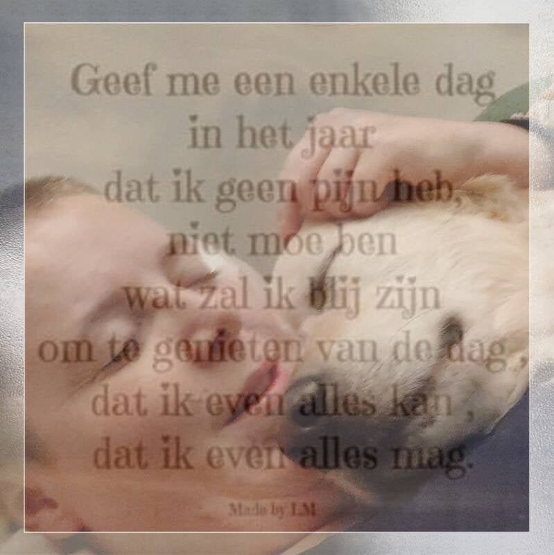 En als het mij ineens overspoeld, weet ik dat ik altijd terecht kan bij lieve lotgenoten die precies begrijpen waar ik mee deal op dat moment. Steun zoeken en vinden bij elkaar en kracht om door te gaan zijn zo enorm belangrijk! En ik ben dankbaar dat ik zo'n mooi vangnet om mij heen heb staan. Vriendinnen die mij aanhoren en mij afleiding bieden zijn ook zo fijn. En 24/7 is mijn liefste hulp er voor mij. Mijn hulp op pootjes Joyca, die bij mij of op mij komt liggen en mij troost biedt en heel veel liefde komt brengen😍 en die mij met alle liefde steeds opnieuw met zijn kwispelende staart komt helpen. En wat ben ik toch dankbaar voor hem❤️