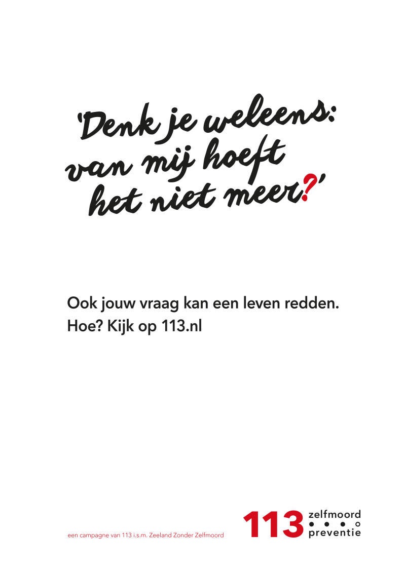 Elke 40 seconden overlijd er wereldwijd iemand aan zelfdoding. En in Nederland alleen al overlijden er gemiddeld jaarlijks 1850 mensen aan zelfdoding. Dit zijn ongeveer 5 mensen per dag.