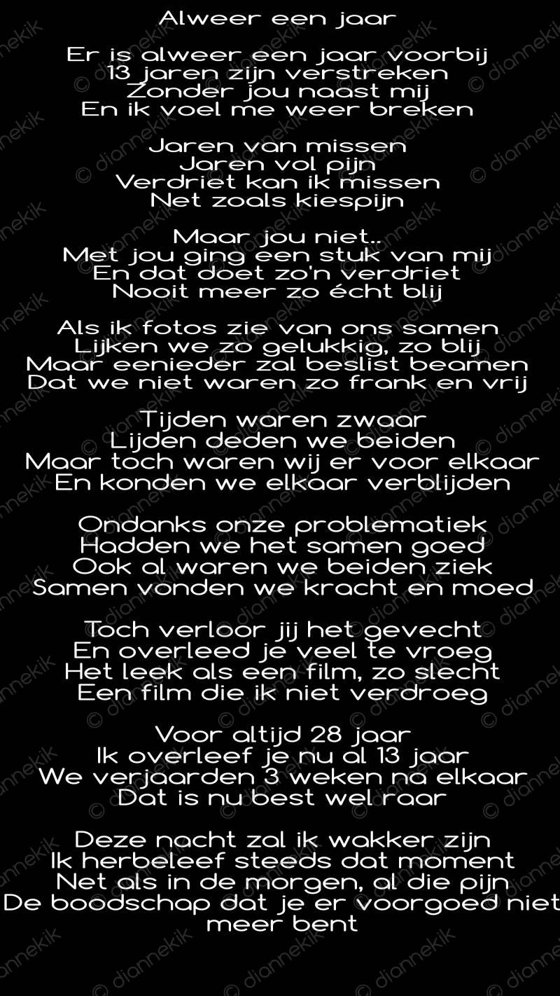 Daar vertellen ze mij het meest verschrikkelijke bericht wat ik maar kan krijgen, namelijk dat jij die nacht was overleden. Meteen begrijp ik dat het jouw onrust was welke ik zo gevoeld heb afgelopen nacht.