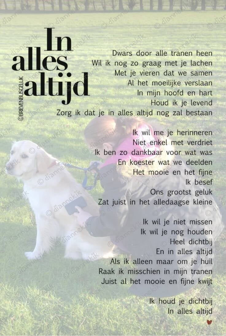 Zodra ik weer wat kan zeggen vertel ik hen dat jij die nacht bent overleden, en voor ik het weet staan we met elkaar te huilen. Zij kenden jou natuurlijk ook goed doordat je heel erg vaak op bezoek kwam. Eigenlijk dagelijks kwam je wel bij me langs. En ze omhelzen me omdat ze weten hoe een hechte vriendschapsband er tussen ons was.