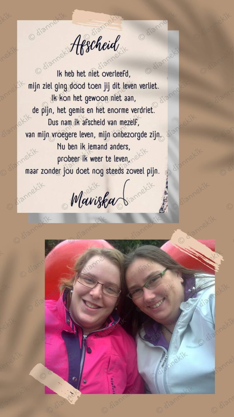 Ik weet en besef steeds meer dat mijn oude ik nooit meer terug zal komen. De vrije blije ik die nog zo vrolijk samen met jou op de foto's staat, is verdwenen tegelijkertijd met jouw overlijden.